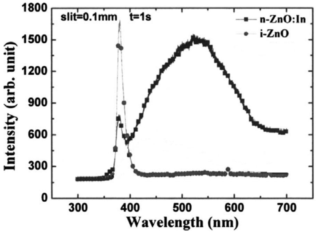 Room temperature PL spectra of the i-ZnO and n-ZnO:In films, excited at 325 nm. Reprinted from Ref. [39] with permission.