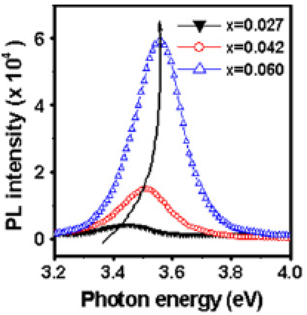 In order to realize modern devices, modulation of the bandgap of the material is required, which has been demonstrated by the development of Zn1–xMgxO [26,41,42,43] and Zn1–zBezO [44,45] alloys for the larger bandgap material and Zn1–yCdyO alloy for the smaller bandgap material [46,47], showing a wide tuning range for ZnO-based materials. In our lab sol-gel method was used to perform the band gap engineering [37,38]. Zn1−xMgxO (x = 0.027, 0.042, and 0.060) films were prepared by the sol–gel method and spin coating technique, using Zn(CH3COO)2·H2O and Mg(CH3COO)2·H2O as start materials and methanol as solvent. After depositing by spin coating, the films were dried at 300 °C for 10 min on a hotplate to evaporate the solvent and remove organic residuals. The procedures from coating to drying were repeated many times. The films were finally annealed in air at 500 °C for 4 h. XRD profiles of the resultant Zn1−xMgxO films suggest the formation of wurtzite structure with a preferred c-axis orientation. And no evidence of MgO phase was seen, confirming the monophasic nature of these compositions. Figure 7 is the BEL (Band-edge luminescence) spectra of Zn1−xMgxO (x = 0.027, 0.042 and 0.060) films [38]. Obvious blue shift was observed when the content of Mg increased, which resulted from an increasing of the band gap.