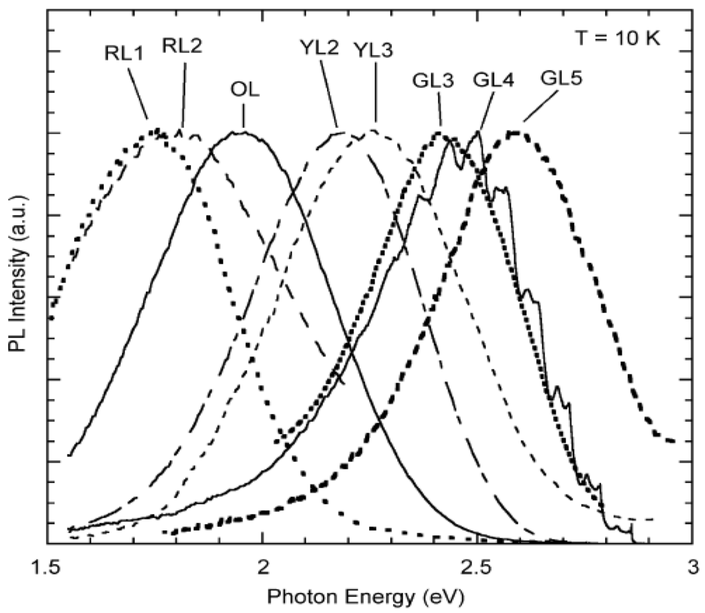 Based on the careful analyses of the spectra they reached the following conclusion. The majority of the defects remained unidentified and transitions responsible for particular bands need to be verified. The most recognizable PL bands are the OL band peaking at 1.96 eV at 10 K (assigned to transitions from shallow donors to a deep acceptor level about 0.5–0.6 eV above the valence band [67]) and the Cu-related GL4 band with the characteristic fine structure.