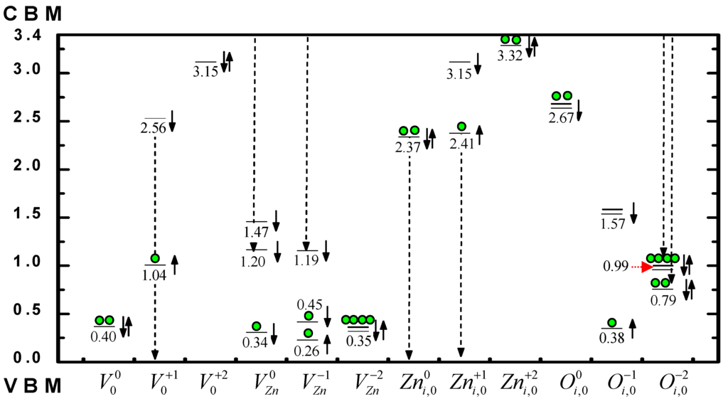In Figure 9, the arrows “↑”, “↓”, and “↑↓” standing next to each level indicate that the corresponding levels are “spin up”, “spin down”, and “spin degeneration”, respectively. The double line “═” represents the doubly degenerate orbital. The solid sphere “●” represents an electron that occupies the level beneath it. The figure represents the occupation scheme under the temperature T = 0 for the ground state of the studied system containing the defect presented explicitly at the bottom of the figure. The dashed vertical arrow lines show the possible transitions corresponding to the green luminescence. The transitions conduction-band minimum (CBM)→1.47 eV () and CBM→1.57 eV () correspond probably to the orange and red luminescence, respectively.