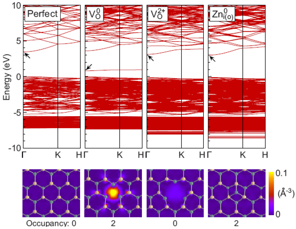 Band structure for bulk ZnO and defects , , contained ones, which was obtained using the hybrid functional. Shown below are the squared wave functions of the states designated by the arrows in the corresponding band diagram, which are plotted for the middle of the (0001) Zn and O planes adjacent to the defects. The projected Zn and O atom positions are denoted with green (dark) and yellow (light) circles, respectively. Reprinted from Ref. [62] with permission.