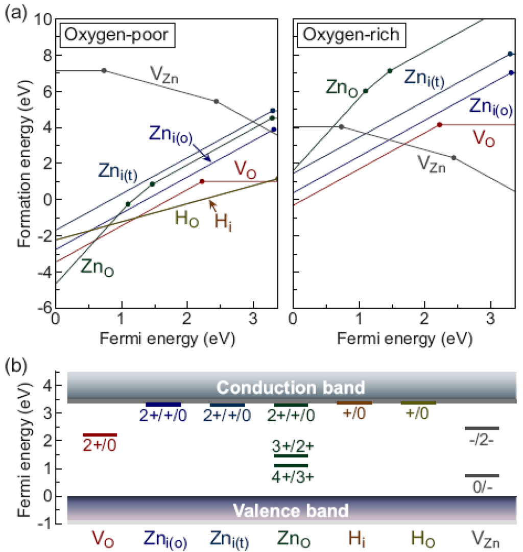 (a) Defect formation energies as a function of the Fermi energy at the oxygen-poor and oxygen-rich limits, (b) Defect thermodynamic transition levels. Reprinted from Ref. [62] with permission.
