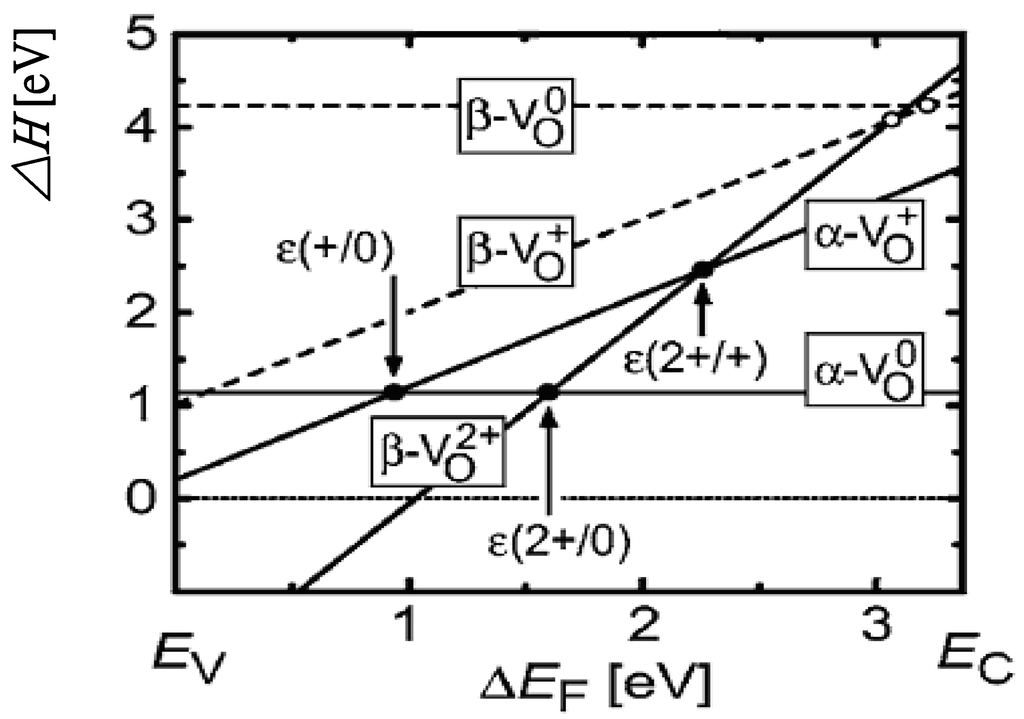 Oba et al. [62] confirmed that for defect VO, (2+/+) lies above (+/0) with (The defect is called a negative-U center). As the Fermi level moves from zero upward, the thermodynamic charge-state transition is thus directly from the 2+ to the 0 charge state, since the formation energy of is higher than that of and for all values of EF, so the charge state is unstable for any position of the Fermi level. This negative-U behavior is typically related to unusually large local lattice relaxations that stabilize particular charge states mentioned above, since these large relaxations significantly reduce the formation energies of and relative to . At the same time they provide a thermodynamic transition level (2+/0) of VO at 1.2 eV below the CBM, very close to the convergence value 1.0 eV obtained by all methods that predict sufficiently large band gaps.