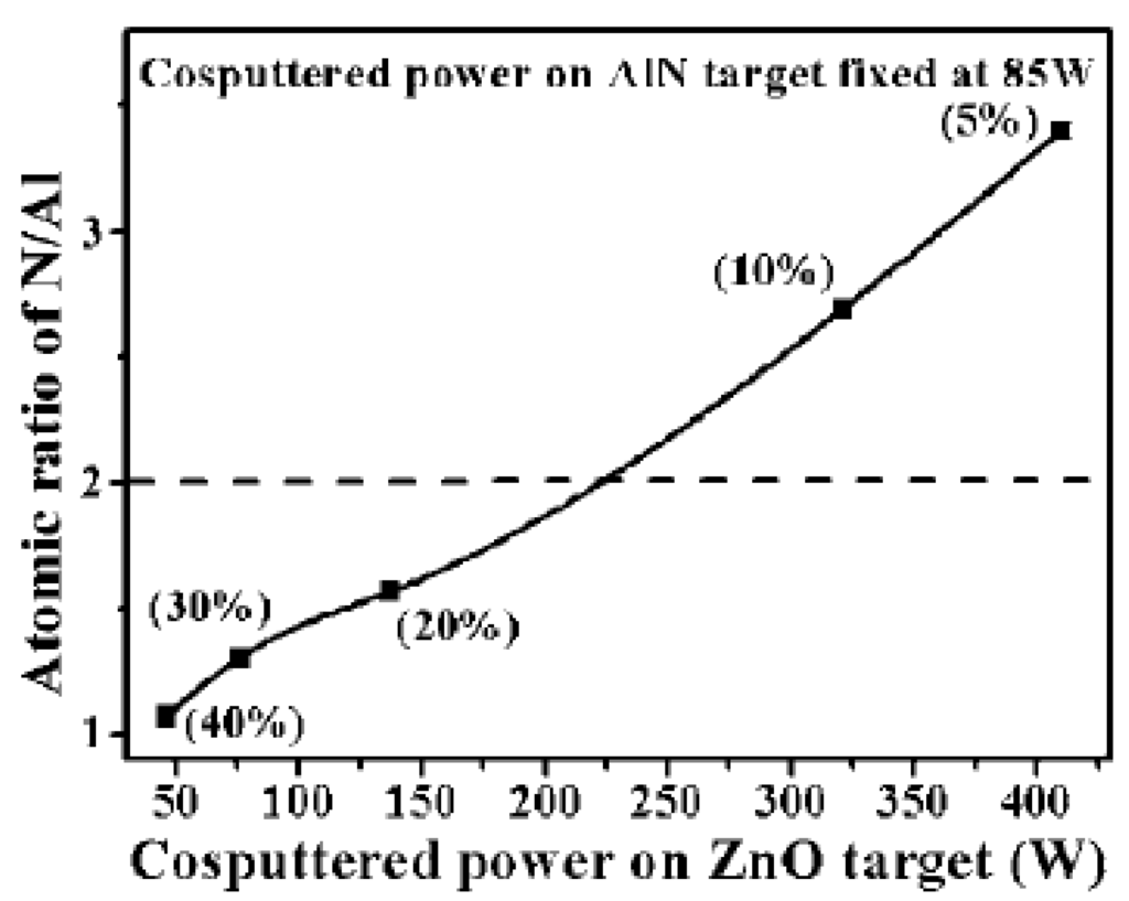 - Bhuvana, K.P.; Elanchezhiyan, J.; Gopalakrishnan, N.; Balasubramanian, T. Codoped (AlN) and monodoped (Al) ZnO thin films grown by RF sputtering: A comparative study. Appl. Surf. Sci. 2008, 255, 2026–2029. [Google Scholar] [CrossRef]