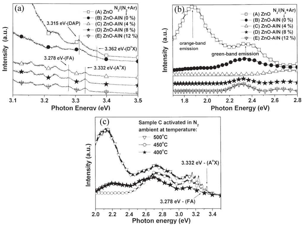 TThe GL bands were often found in observed PL spectra of samples prepared in our lab and they usually were attributed to oxygen vacancy defects. For example, a green-band emission was observed both for the undoped ZnO film and the p-type AlN codoped ZnO films [58], and the intensities were smaller for the latter, which implies that less oxygen vacancies existed in them. However, in a work on ZnO-on-GaN heterostructures grown using the vapor cooling condensation system [39], compared to undoped ZnO, a remarkable broad green emission band in ZnO:In films was observed, and it was considered to be induced by the oxygen vacancies. Moreover, in our work on ultraviolet (UV) emission of In-doped ZnO nanodisks grown by carbothermal reduction at 1000 °C [59], air-cooled ZnO nanodisks showed a strong green emission, while furnace cooling in conjunction with introducing O2, around 1.0%, into flowing Ar during the growth significantly enhanced the growth rate and UV emission of ZnO nanodisks (while the green emission was significantly suppressed). The causes were attributed to the reduction of oxygen vacancies and surface defects. Besides, for the Zn1−xMgxO films prepared by the sol–gel technique [38], a GL was observed and its intensity decreased (while the intensity of the band-edge luminescence was seen to increase) with the increase of Mg content, which was partly attributed to a decrease in the number of VO-related defects.
