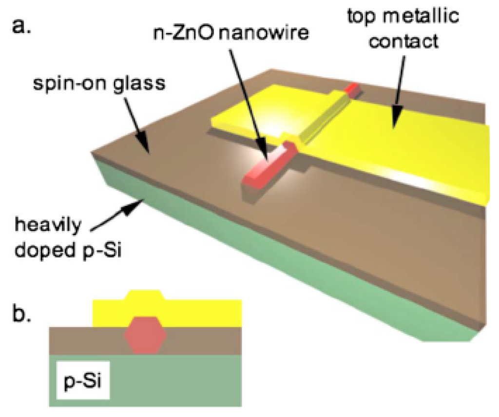 - Sun, H.; Zhang, Q.; Zhang, J.; Deng, T.; Wu, J. Electroluminescence from ZnO nanowires with a p-ZnO film/n-ZnO nanowire homojunction. Appl. Phys. B 2008, 90, 543–546. [Google Scholar] [CrossRef]