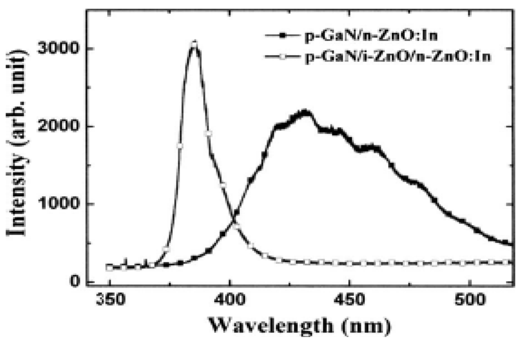 - Yu, Q.X.; Xu, B.; Wu, Q.H.; Liao, Y.; Wang, G.Z.; Fang, R.C.; Lee, H.Y.; Lee, C.T. Optical properties of ZnO/GaN heterostructure and its near-ultraviolet light-emitting diode. Appl. Phys. Lett. 2003, 83, 4713–4715. [Google Scholar] [CrossRef]