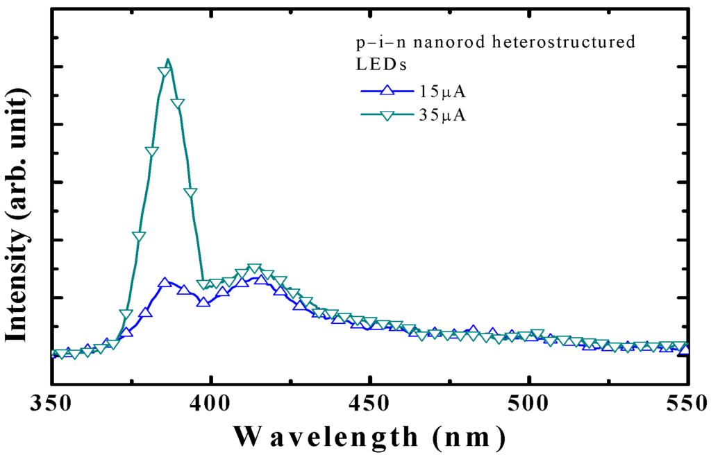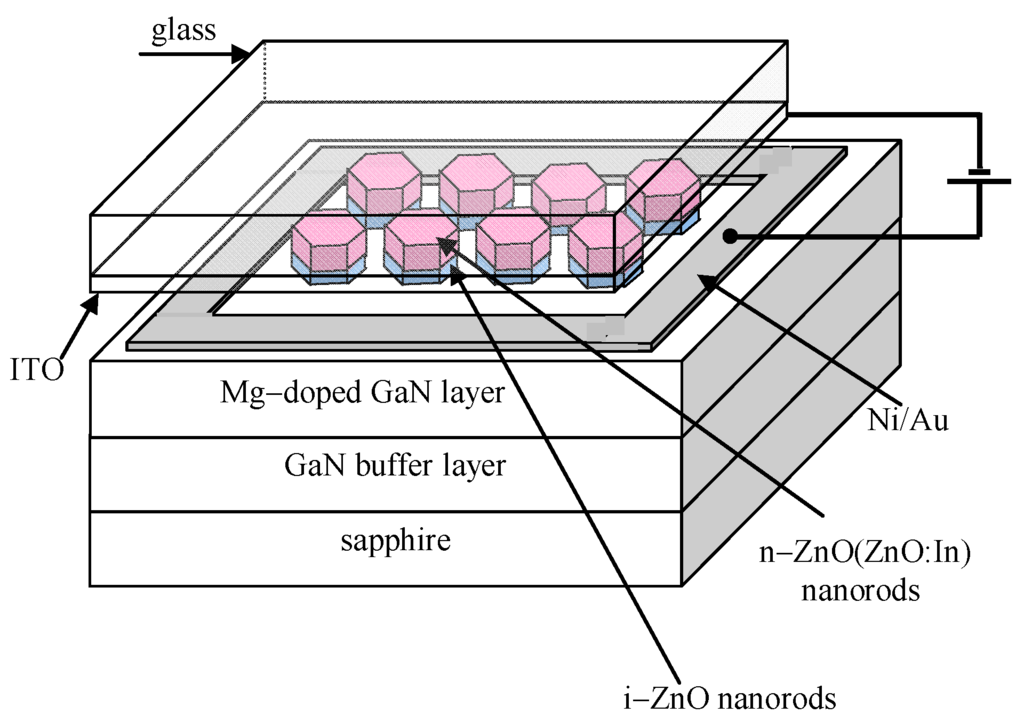 - Yan, J.T.; Chen, C.H.; Yen, S.F.; Lee, C.T. Ultraviolet ZnO nanorod/p-GaN heterostructured light-emitting diodes. IEEE Photo. Technol. Lett. 2010, 22, 146–148. [Google Scholar] [CrossRef]