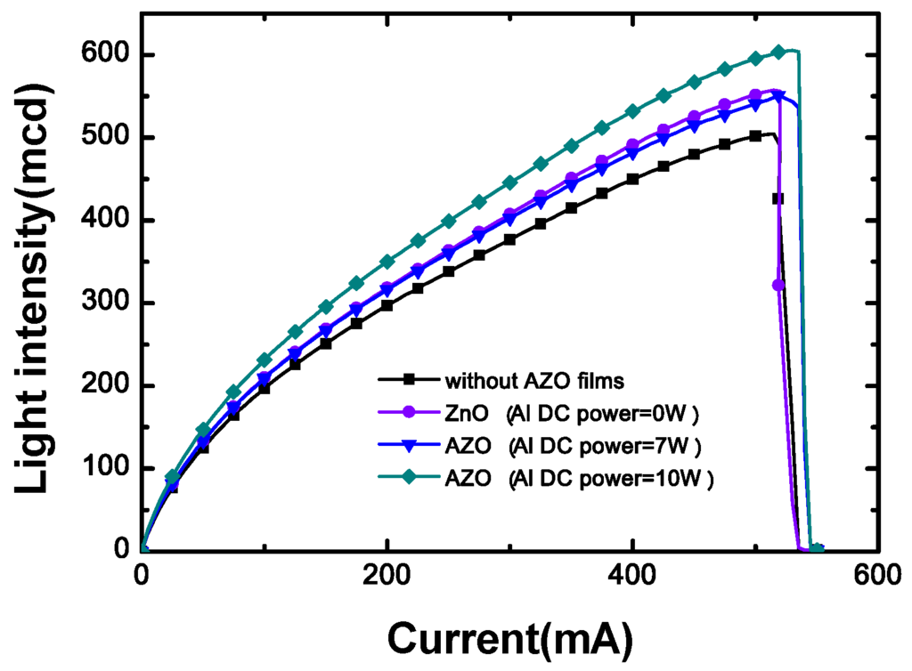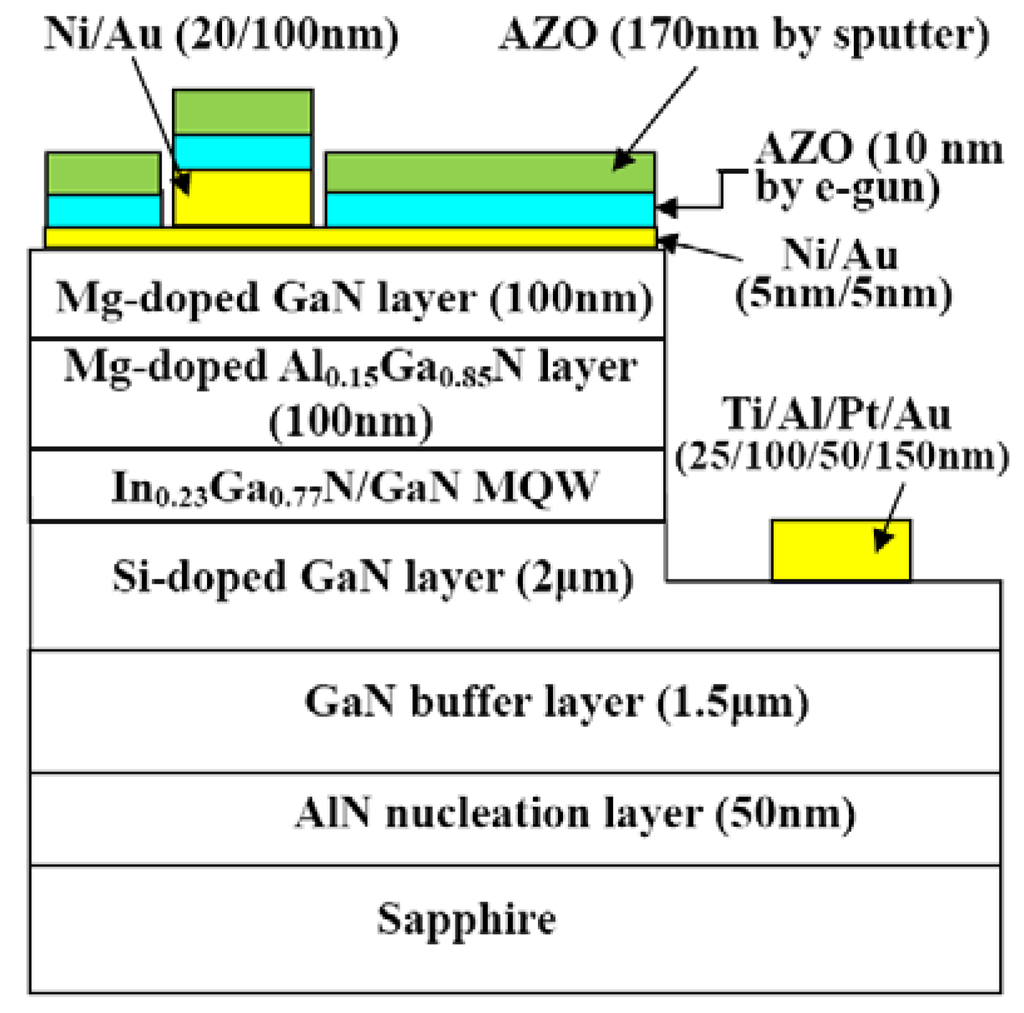 - Lee, C.T.; Chou, Y. H.; Yan, J.T.; Lee, H.Y. Light enhancement of Al nanoclusters embedded in Al-doped ZnO films of GaN-based light-emitting diodes. J. Vac. Sci. Technol. B 2009, 27, 1901–1903. [Google Scholar] [CrossRef]