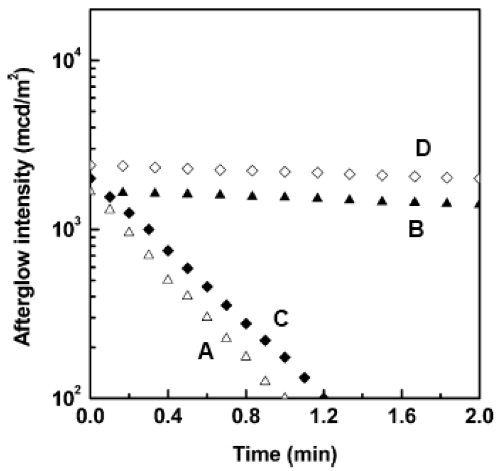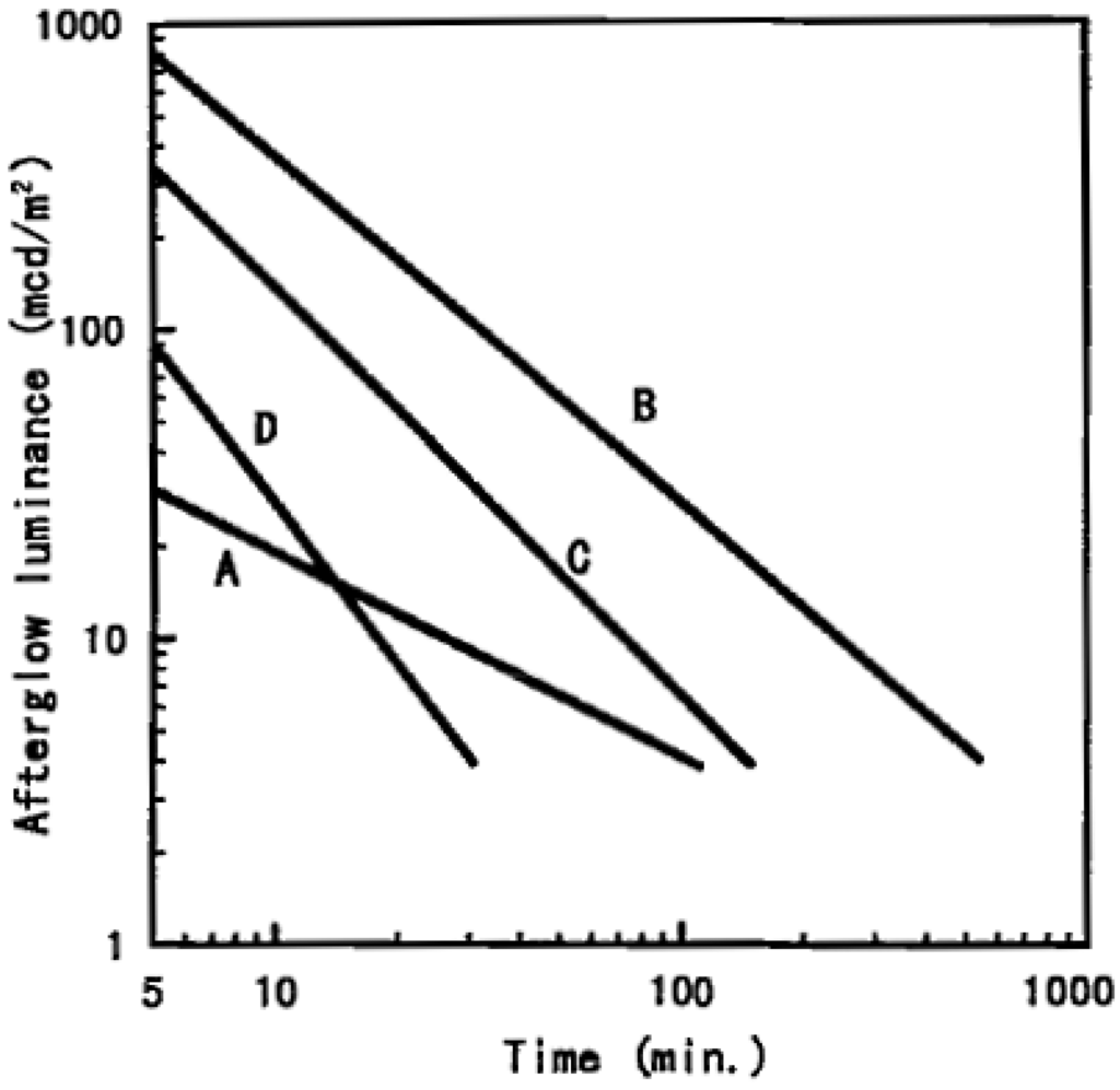 | SrAl2O4:Eu2+,Dy3+ | initial rise | 0.55/0.60/0.65/0.75 | [111] |