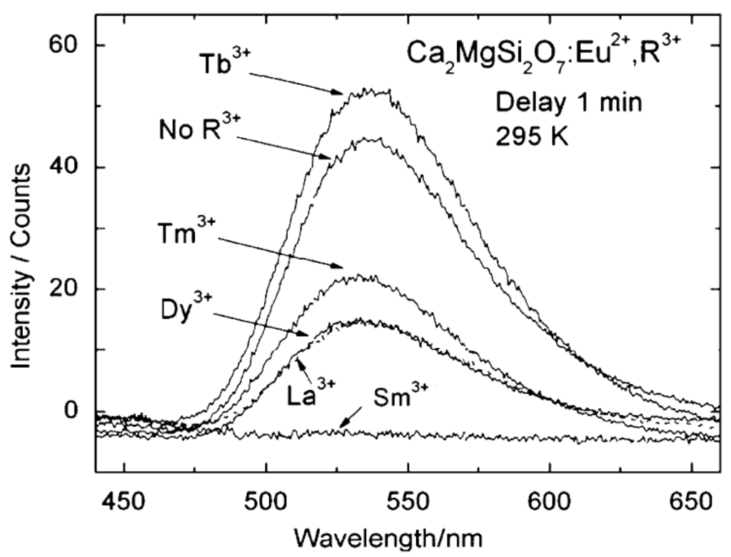 - Qi, Z.; Shi, C.; Liu, M.; Zhou, D.; Luo, X.; Zhang, J.; Xie, Y. The valence of rare earth ions in R2MgSi2O7:Eu, Dy (R = Ca, Sr) long-afterglow phosphors. Phys. Status Solidi A-Appl. Mat. 2004, 201, 3109–3112. [Google Scholar] [CrossRef]