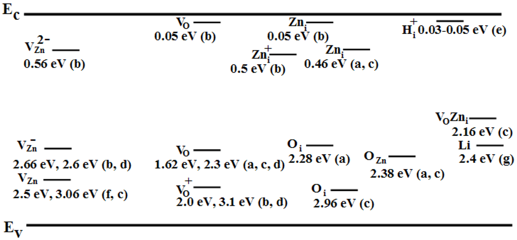 Energy levels of the different deep level defects in ZnO reported in the literature by different groups: (a) ref [54]. (b) ref. [43].(c) ref. [56]. (d) ref. [44]. (e) ref. [25]. (f) ref. [14] and (g) ref. [9,35]. The + and – symbols represent charged deep levels. Three shallow levels are also shown, due to neutral oxygen vacancies, positively charged extrinsic hydrogen, and neutral zinc interstitials. In addition, the position of the deep level due to VOZni clusters is indicated.
