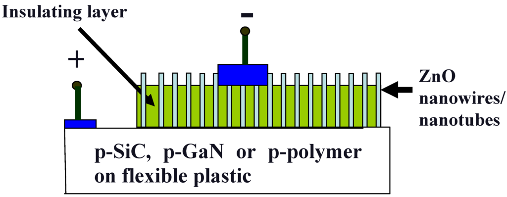 From the preceding discussion on the properties of the commonly reported deep level centers in ZnO and their associated possible transitions, it is clear that ZnO can emit luminescence over the entire visible region. Although no consensus has been reached regarding the origin of the different observed colors, partly due to the different defect configurations in different samples [3,38], ZnO provides the potential for creating white light emitting diodes, especially considering the recent progress in the growth and reproducibility of ZnO nanostructures grown on a variety of other p-type substrates [2]. The development of low temperature chemical growth approaches as suitable techniques for large area synthesis of ZnO nanorods with excellent luminescence properties on any substrate opens up new possibilities for developing hybrid ZnO pn junctions. One of these hybrid junctions is a combination of ZnO nanorods and p-type semiconducting polymers. Below, we will report recent results obtained from different ZnO nanorods and nanotubes grown through different methods on p-SiC, p-GaN, and p-polymer layers on flexible plastic, and we will report their use to fabricate white light emitting diodes (LEDs).
