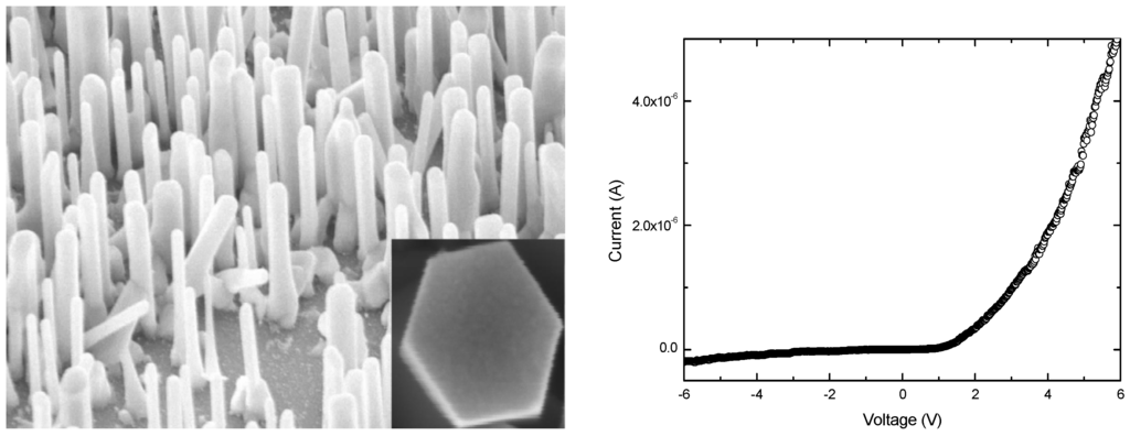 (Left) A typical SEM image of ZnO nanorods grown by the VLS technique on a 4H-p-SiC epitaxial layer. (Right) Typical room temperature I-V characteristics obtained from the LED fabricated with n-ZnO nanorods/4H-p-SiC.
