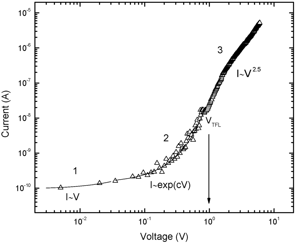 Lampert and Mark [50] have developed the single carrier SCLC model in the presence of a trap above the Fermi level. According to this model, at an applied voltage of V>VTFL (TFL indicates the trap filled limit) all of the trap levels are filled, the conduction becomes space charge limited, and the current follows the Mott and Gurney SCLC expression [51]. The trap filled limit voltage VTFL is given as [50]: