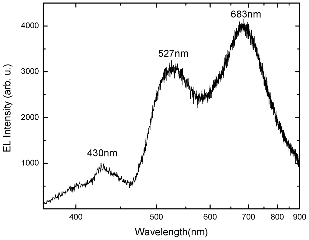The EL measurement of the ZnO-based heterojunction was carried out using a photomultiplier detector at room temperature. Figure 5 shows the corresponding EL spectrum, indicating three peaks at 430 nm (violet), 527 nm (green) and 683 nm (red). Several groups have reported that different defect centers in ZnO are responsible for the blue, green and red emissions [3,54]. Leiter et al. observed a broad green band centered at 2.45 eV and assigned it to the oxygen vacancy (Vo) [55]. The 2.38 eV green emission has been attributed to the oxygen antisite (OZn) on theoretical grounds [56]. There is still controversy in the literature about the origin of the luminescence centers observed in ZnO materials [57]. Recent studies have demonstrated that the green emission at 533 nm is related to oxygen vacancies VO, and the red emission at 683 nm is related to zinc vacancies or excess oxygen [3,52]. Our EL spectra demonstrate peaks at 527 nm and 683 nm, and these are due to VO and VZn in the ZnO nanorods, respectively [3,33]. The violet emission at 430 nm is due to the interstitial zinc (Zni) [3]. It was recently reported that the violet emission corresponds to Zni and the transition involving VZn would result in blue emission [3,39,58]. It has also been reported that in wide band gap semiconductors, the broad band luminescence is related to transitions from donor states to deep acceptor states [59].