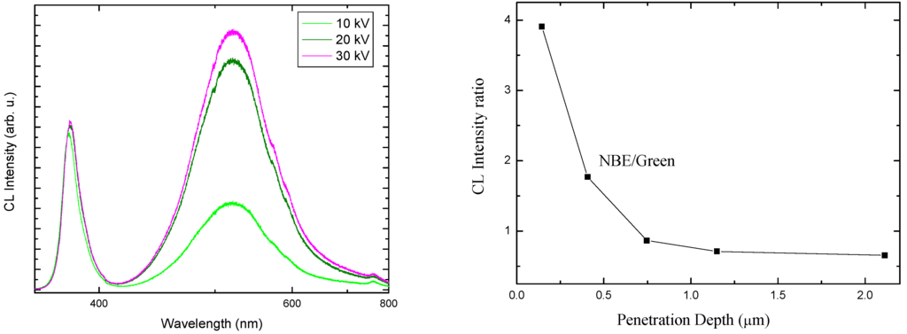 Cathodoluminescence (CL) spectroscopy was performed to obtain detailed emission information and to explain the origin of specific emissions from specific areas. The cathodoluminescence spectroscopy technique involves an incident electron beam of an energy that produces free electron-hole pair recombination across the bandgap or between deep levels and the band edges. The CL penetration depth increases with increasing beam energy, as determined by the energy-range relationships for energy loss within a solid [60,61]. CL signals from different depths within the bandgap of the material can be excited, and the average depth distribution of the luminescence can thus be determined. The acceleration voltage for this study was varied from 10 to 30 kV, which corresponds to maximum penetration depths of 0.4–2.16 µm, as calculated from the Kanaya-Okayama model [61].