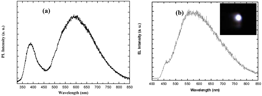(a) Room temperature PL spectrum of ZnO nanotubes grown on GaN. (b) The corresponding electroluminescence spectrum obtained from the same ZnO nanotubes/p-GaN LED. The inset displays a digital photograph showing the light emission.