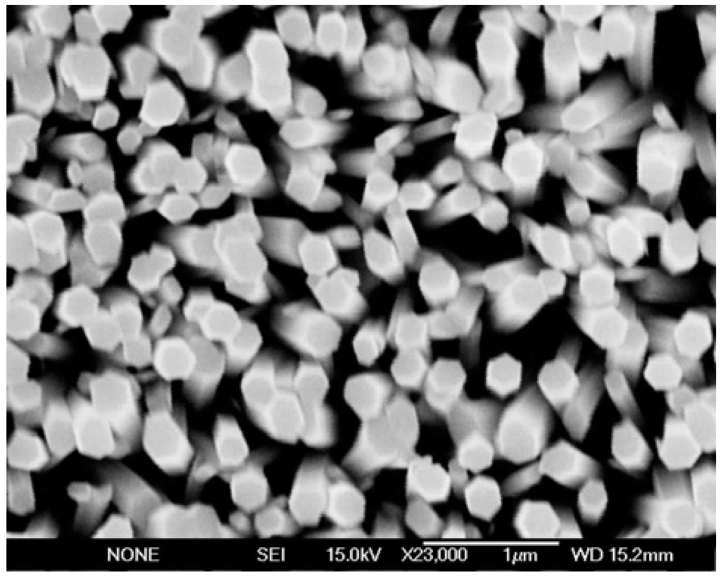 ZnO nanorods were grown using the vapor liquid solid (VLS) high temperature technique on a 4H-p-SiC epitaxial layer, for the purpose of forming a pn heterojunction (described below). The grown nanorods were found to be aligned vertically and the nanorod length varied within the range 1.9–2.2 μm, as shown in the scanning electron microscope image (SEM) in Figure 3.