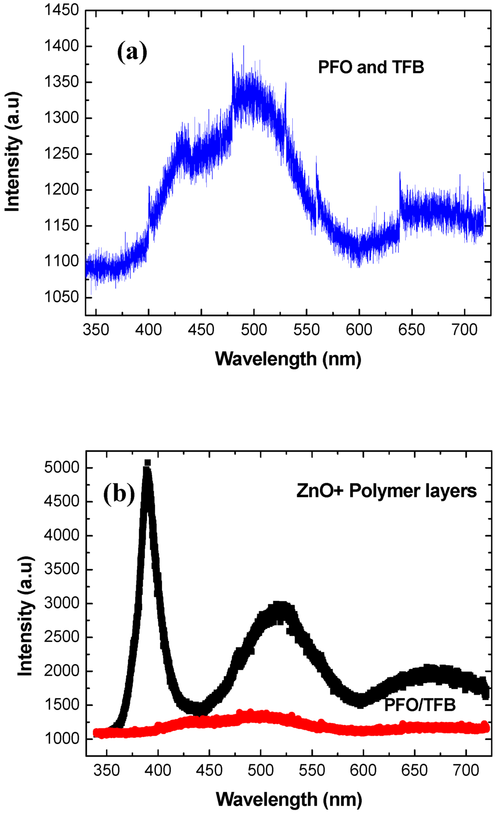 (a) Room temperature PL spectrum obtained from p-type polymer(s) layers spin-coated onto flexible plastic. (b) The corresponding room temperature PL spectrum after the low-temperature growth of ZnO nanorods. The lower curve represents the PL presented in part (a) of the figure to allow for a comparison of intensities.