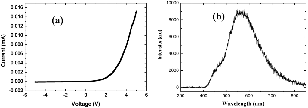The electrical behavior of the hybrid LEDs obtained using the ZnO nanorods grown at 50 °C was investigated, and rectifying behavior was observed. Figure 11(a) shows typical I-V characteristics, revealing rectification behavior with a turn-on voltage as low as 2.4 V. Light emission was detected at current levels of about 0.2 mA. The diode was stored for a few weeks (12 weeks) and investigated again, and no degradation was observed. Figure 11(b) shows the electroluminescence spectrum of this hybrid organic-inorganic LED, with a broad band covering emissions from just above 400 nm and up to nearly 700 nm, with a peak at around 560 nm. As the next step in the construction of a functional LED, we are now examining the light quality and output power of this hybrid LED.