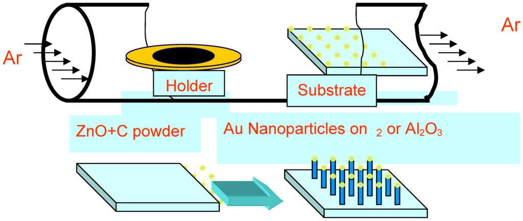 VLS based processes have been widely used for the growth of various nanostructures since the first demonstration in 1964 by Wagner and Ellis [79]. The VLS process can be divided into two steps: the formation of a small liquid droplet and the nucleation and growth of the nanorods. Generally, the growth of ZnO nanorods is accomplished by employing metal clusters as catalysts. The metal can be chosen rationally using the phase diagram on the basis of the solubility of the nanorods’ component elements in the liquid phase. The growth direction and diameter of the ZnO nanorods during the growth process are highly dependent on the metal droplet, which is composed of the metal catalyst and the nanorod material. Au is the most commonly used catalyst for the growth of ZnO nanorods when using the VLS growth method [80] because Au has the ability to form a eutectic mixture with the ZnO material at temperatures far below the melting point of ZnO. Other metals such as tin have also been successfully used to synthesize high-quality ZnO nanorods [5]. The method of thermal evaporation was used to grow ZnO nanorods on a p-SiC substrate using Au as a catalyst in a flat quartz oven. Figure 12 shows a typical experimental setup used for the growth of ZnO nanorods. A thin layer of Au (3–5 nm) was first deposited onto the p-SiC substrate. High-purity (99.9%) commercial ZnO powder was used as the main source material. The high purity ZnO powder was mixed with high purity (99.9%) graphite at a 1:1 ratio, and the mixture was placed in a quartz boat. The mixed powder was vaporized at elevated temperatures (>890 °C) and Zn condensed onto the substrate containing the Au particles and then reacted with oxygen, resulting in catalyzed epitaxial growth of ZnO nanorods. The gas composition in the quartz furnace tube has a strong influence on the formation of ZnO nanorods. The diameter and size of the ZnO nanorods can be tuned by controlling the thickness of the evaporated Au and the growth time, respectively. A more detailed description of our VLS processes can be found in [81].