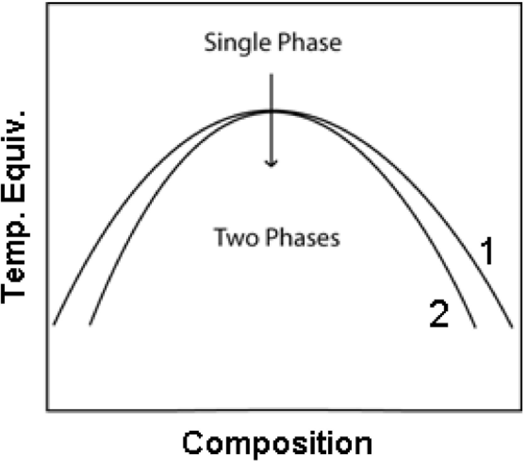 Phase separation diagram (1 and 2 denote binodal and spinodal lines, respectively).