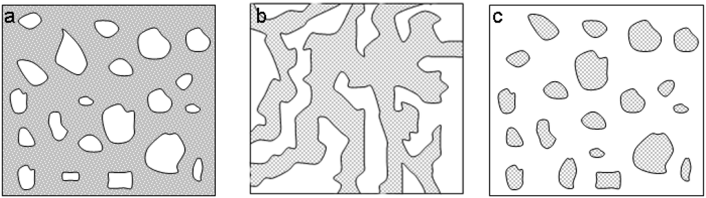 When the volume fractions of interconnected phase domains are comparable, a bicontinuous, spongelike structure forms (Figure 2b). This structure is characterized by continuous mutually conjugated domains with hyperbolic interfaces [29]. Figure 2 illustrates the structures that can be obtained by different reagent compositions [29]. A bicontinuous network is only obtained within a strict composition and condition regime. Otherwise, the result is isolated pore structures or powders.