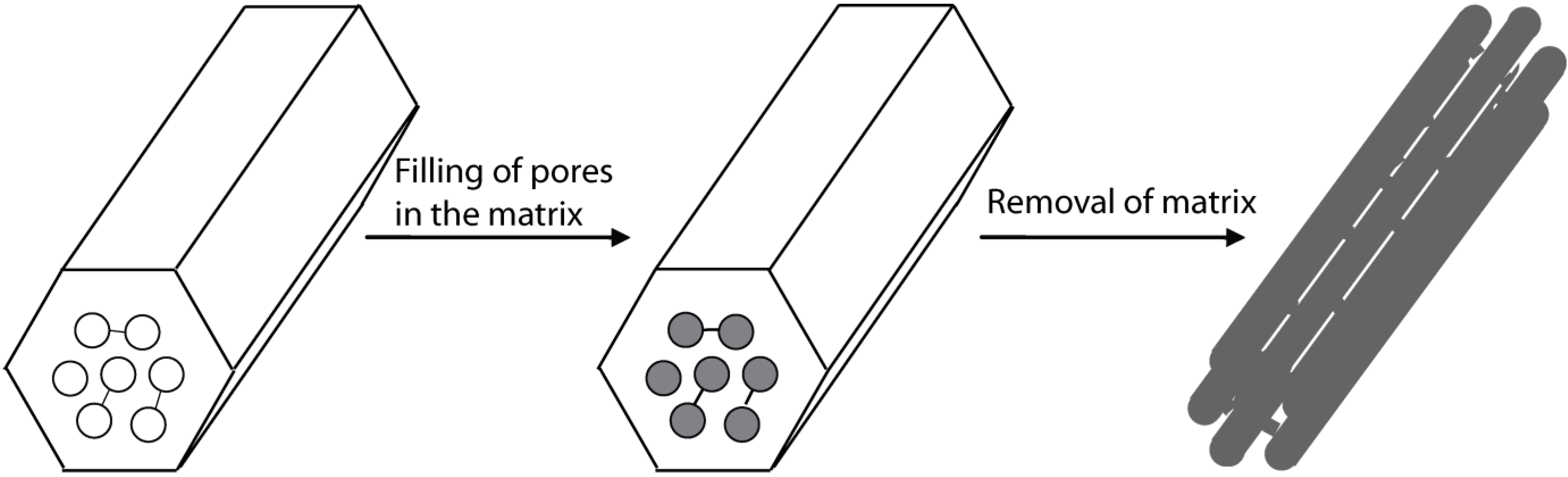 The replica method is an approach involving reproduction of the macro- and mesoporous structure of a template. Usually porous silica prepared by the sol-gel method is used as the rigid matrix template. One or more precursors are incorporated into the pores of the matrix by imbibition. After heat treatment, a continuous solid framework of the desired material is preserved within the pores. Subsequently, the matrix is removed by etching and both the macro- and mesostructures of the voids in the original matrix is replicated (see Figure 3) i.e,. the walls of the matrix have become the voids of the replica. [38,39,40,41]
