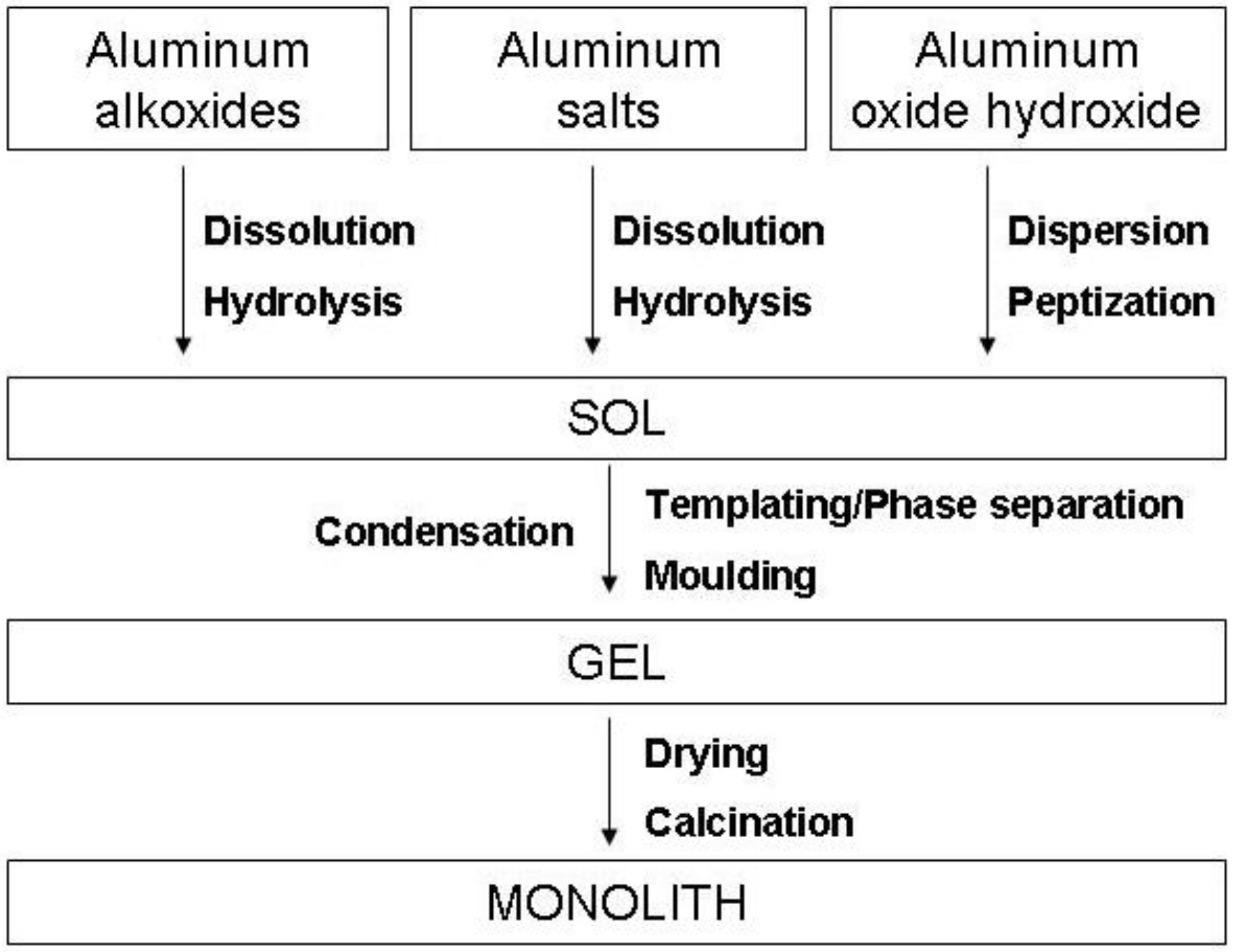 Three classes of alumina precursors are typically used for sol preparation (1) aluminium alkoxides (2) inorganic alumina salts (3) aluminium oxide hydroxide (boehmite) or aluminium hydroxide (bayerite), either in the form of gel or as dispersed nanopowder (see Figure 4.).