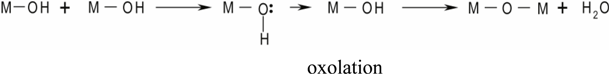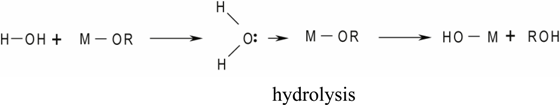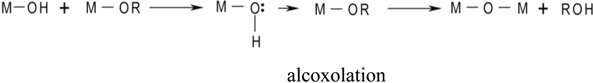 Sols can be prepared from both organic and inorganic compounds. Hydrolysis and polycondensation reactions usually occur simultaneously and the reaction rates depend on the type of precursor as well as reaction conditions like pH, temperature and ionic strength. Hydrolysis of alkoxy precursors (≡M-ORn, where M is the metal atom and R is the alkyl group) occur due to nucleophilic substitution of alkoxy groups by water. The mechanism involves nucleophilic addition followed by proton transfer (see equation below). The hydrolyzed precursors (≡M-OH) can react either with alkoxy precursors (alcoxolation) or with other hydrolyzed precursors (oxolation). In both cases the result is polycondensation [18,19].