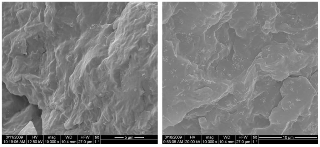 SEM micrographs for the nanocomposites containing 1 wt % (left) and 3 wt % (right) MWCNTs. Reproduced with permission from ref. [13].