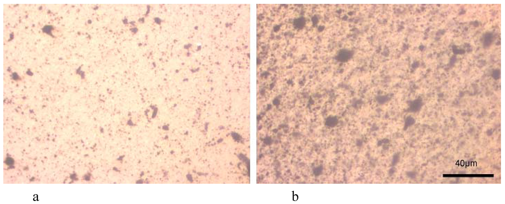 Optical micrographs of PP/MWCNTs nanocomposites containing different MWCNTs content. a) 0.5 wt % and b) 2.5 wt %.