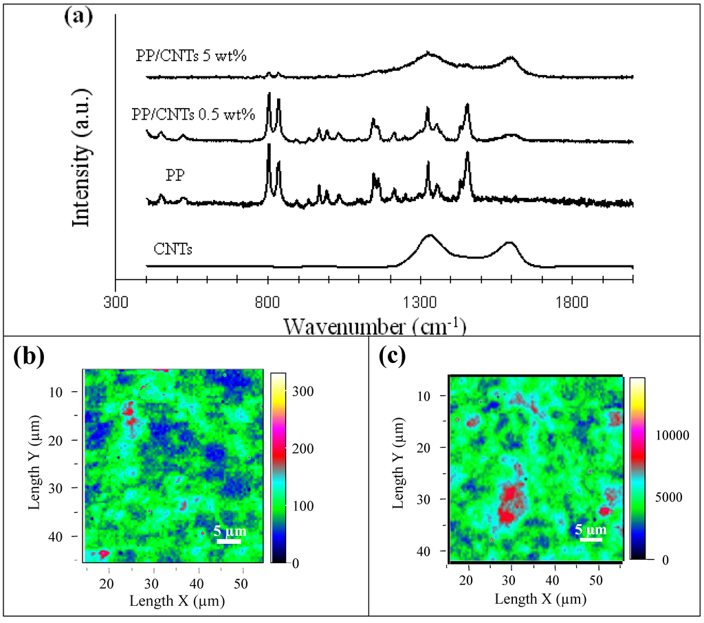(a) Raman spectra of CNTs, neat iPP, and composites at 0.5 and 5 wt % CNTs content. (b) and (c) Micro-Raman maps from samples containing 0.5 wt % and 5 wt % CNTs, respectively. The color bar indicates the intensity of the peak at 1594 cm-1.