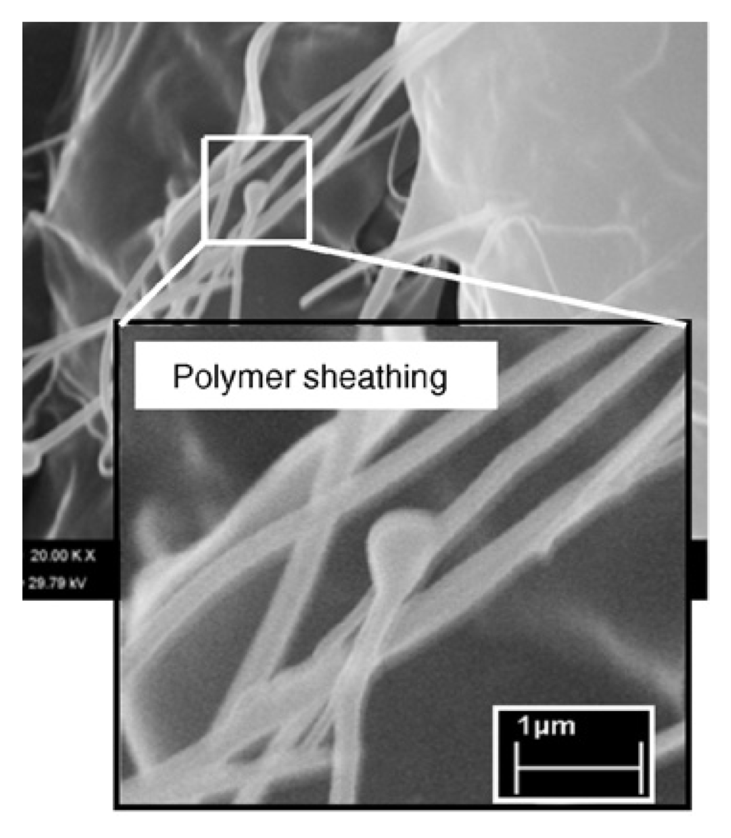 SEM micrograph of ‘‘polymer sheathing” phenomena of the fractures surface of PP/MWCNTs nanocomposite with 1 wt % of MWCNTs. Reproduced with permission from ref. [19].
