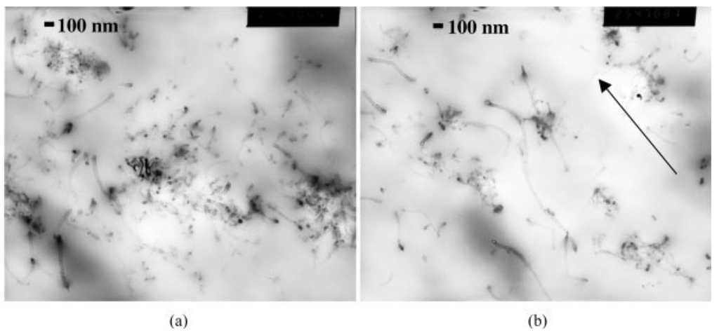 TEM Images of 3 wt % MWNTs in PP a) un-oriented; b) oriented, 12:1 draw ratio. Arrow indicates the direction of orientation. Reproduced with permission from ref. [8].