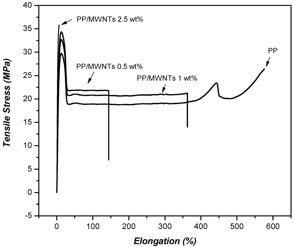 Typical tensile stress–strain curves of nanocomposite samples with respect to their nanotube content are shown in Figure 8. The stress–strain curves of PP/MWCNTs exhibit distinctly regions of elastic, yielding and plastic deformation accompanied by cold drawing, whereas continued deformation after the yield point resulting in necking along the gauge length. For PP, the typical behavior of a ductile material is observed with a very high elongation at break (620%). The strain hardening region appears at about 400% of elongation and after which tensile strength increases almost linearly with strain until fracture eventually occurs. Also, in case of nanocomposites with lower loading (1 wt % MWCNTs) a ductile behavior is observed with necking, but with lower strain at fracture and without strain hardening. Nanocomposites bearing higher nanotube content (2 wt % MWCNTs) showed a brittle behavior with breaking after the yield point [23,24,25].
