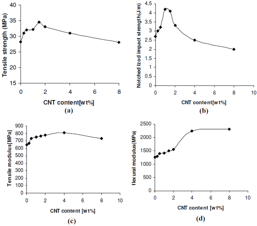 Mechanical properties of PP/CNTs nanocomposites. a) Tensile strength, b) notched Izod impact strength c), tensile modulus and d) flexural modulus. Reproduced with permission from [26].
