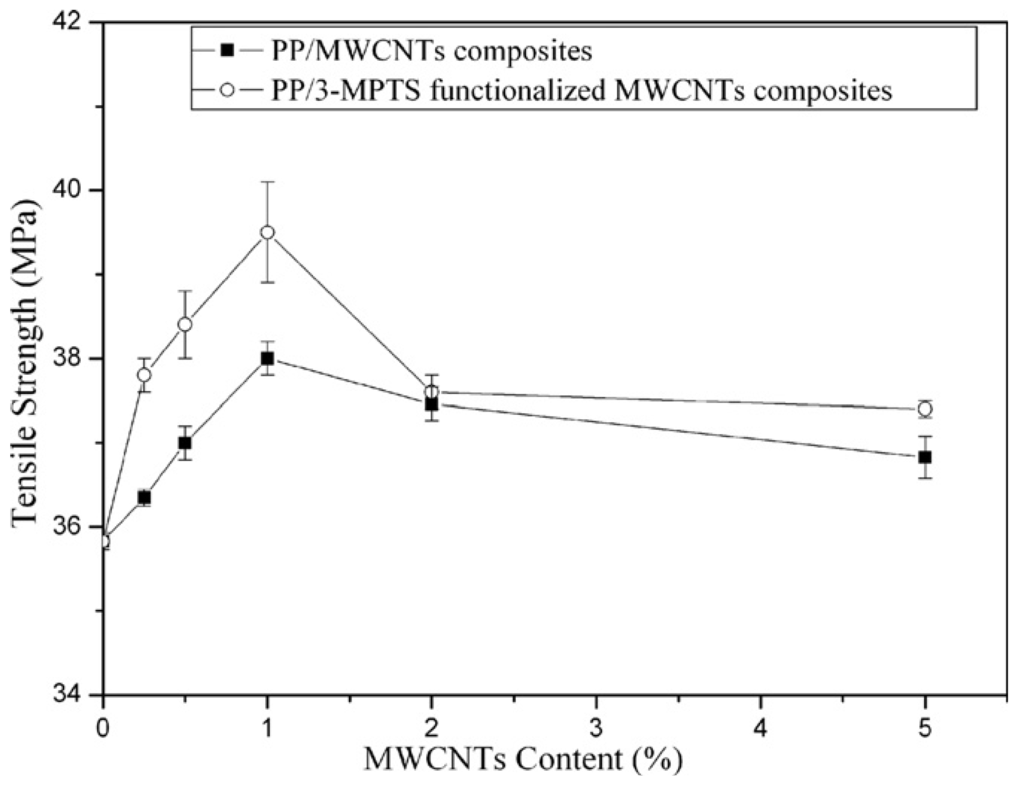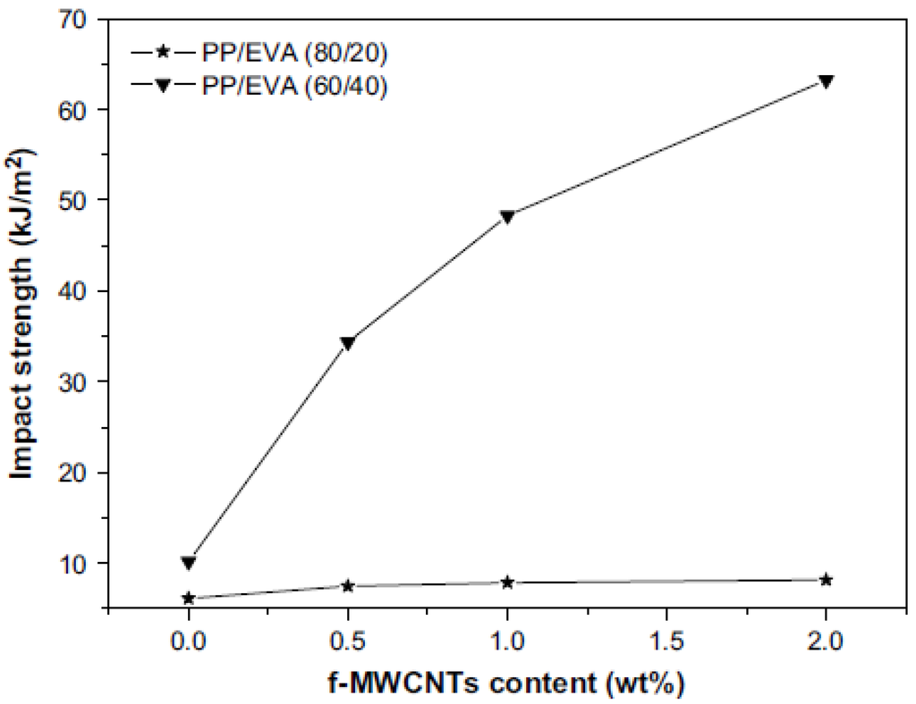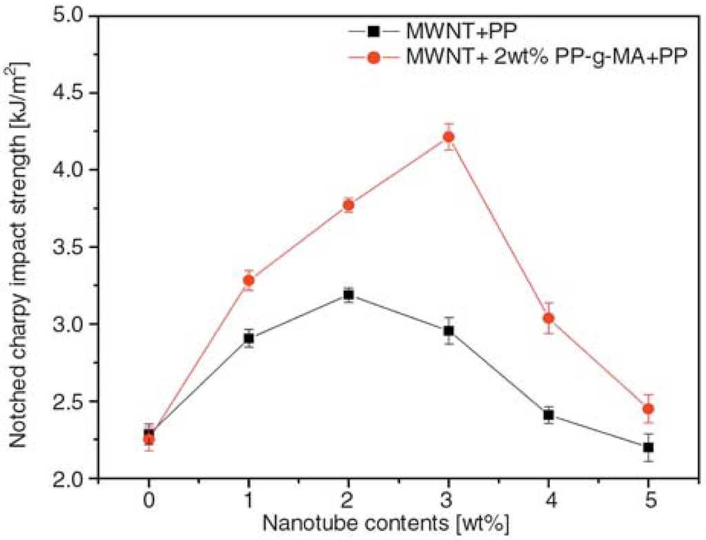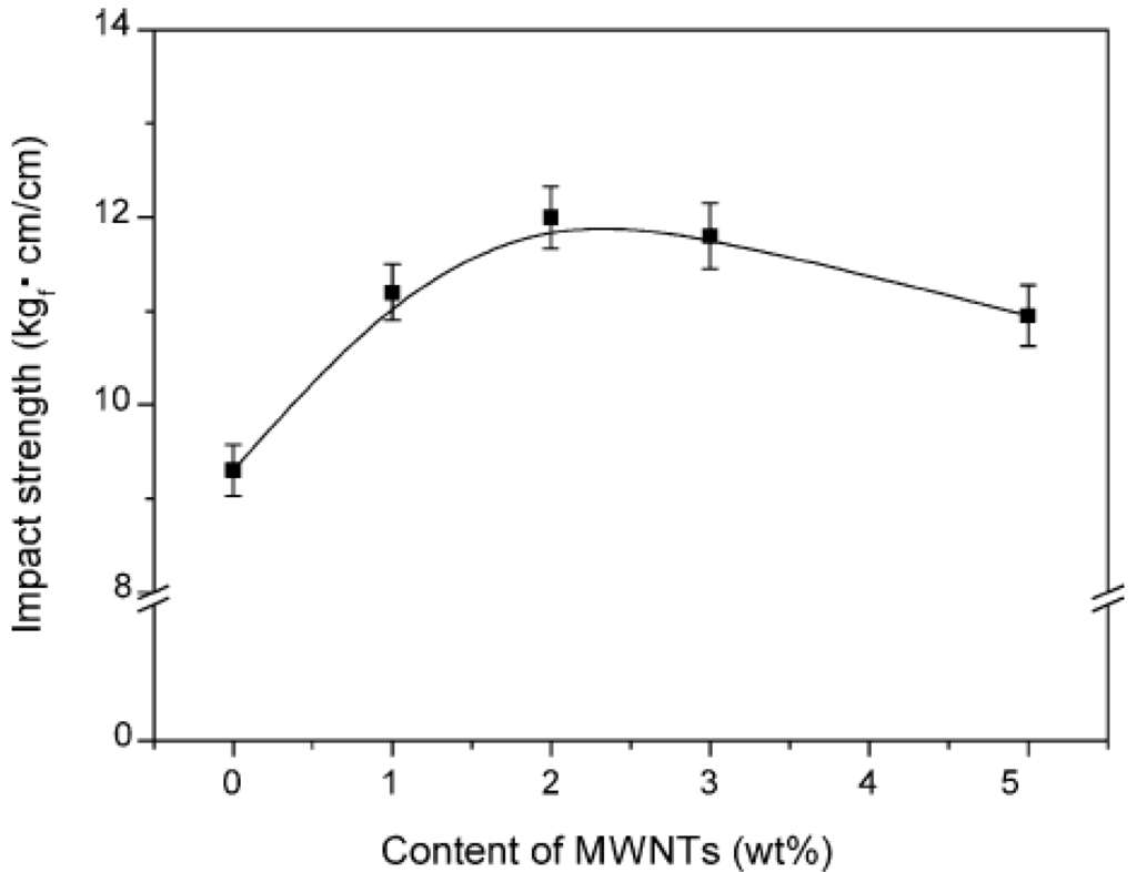 Impact strength of MWCNTs/PP composites as a function of MWNTs content. Reproduced with permission from ref. [30].