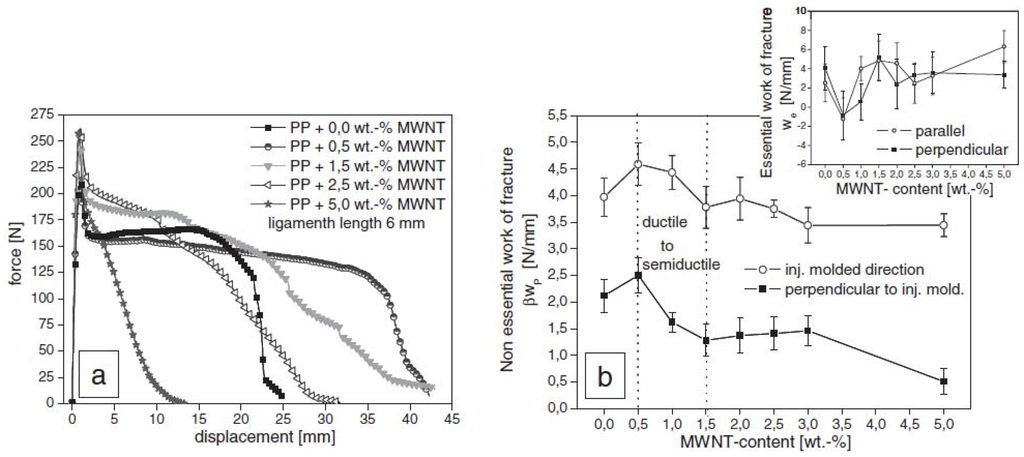 A ductile-to-semiductile transition in the crack resistance behavior of PP/MWCNTs composites is discussed by Satapathy et al. [32] using an essential work of fracture approach based on a post yield fracture mechanics concept and its possible interrelation to the structural attributes studied by TEM, SEM, and WAXD. A maximum in the non-essential work of fracture is observed at 0.5 wt.% MWCNTs content, which demonstrates the enhanced resistance to crack propagation compared to pure PP, followed by a sharp decline with the increase in MWCNTs content to 1.5 wt %, which reveals a ductile-to-semiductile transition (Figure 12).