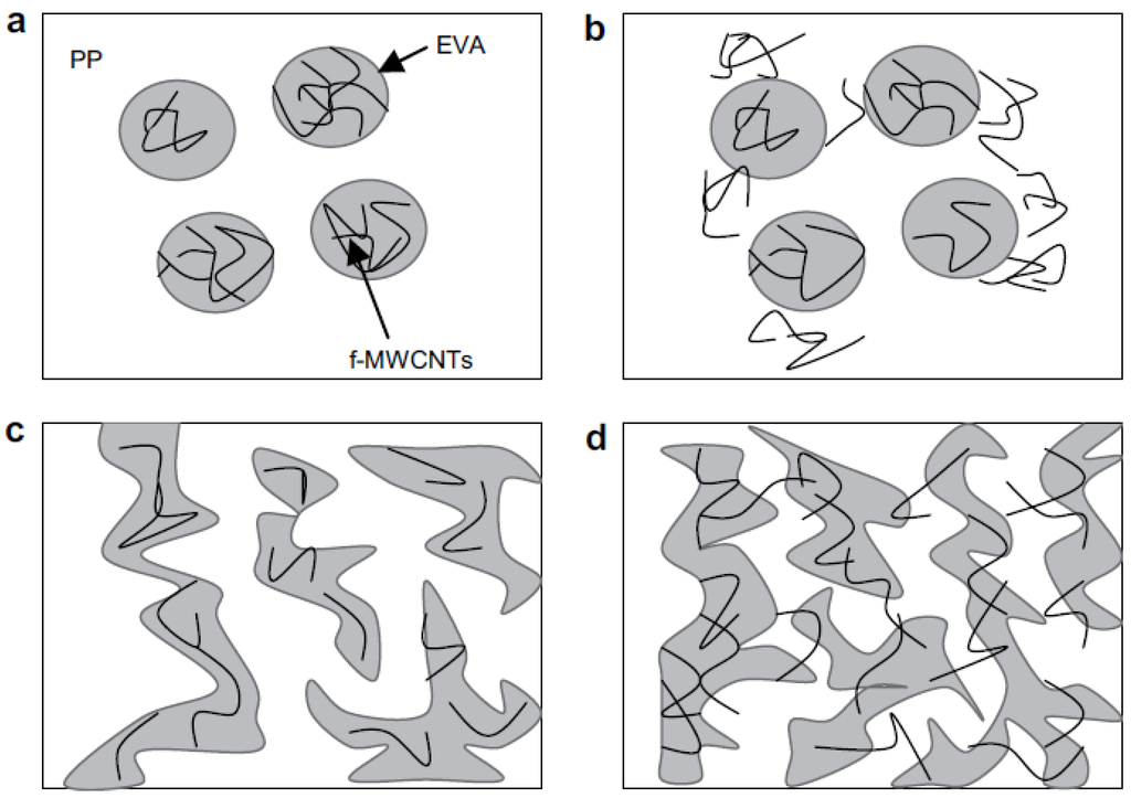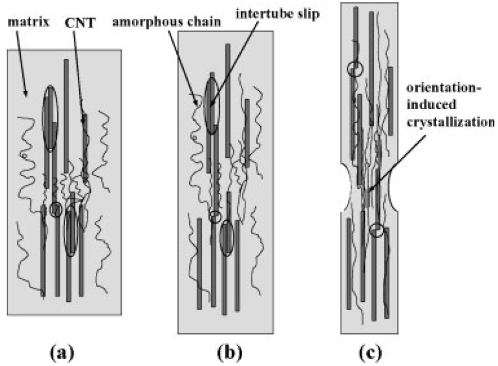 Creep resistance of PP can be significantly improved by the addition of CNTs. [33]. Three possible mechanisms of load transfer were considered that could contribute to the observed enhancement of creep resistance, which are: (1) fairly good interfacial strength between MWCNTs and polymer matrix, (2) increasing immobility of amorphous regions due to nanotubes acting as restriction sites, and (3) high aspect ratio of MWCNTs. A schematic deformation model under uniaxial stress is demonstrated in Figure 13.