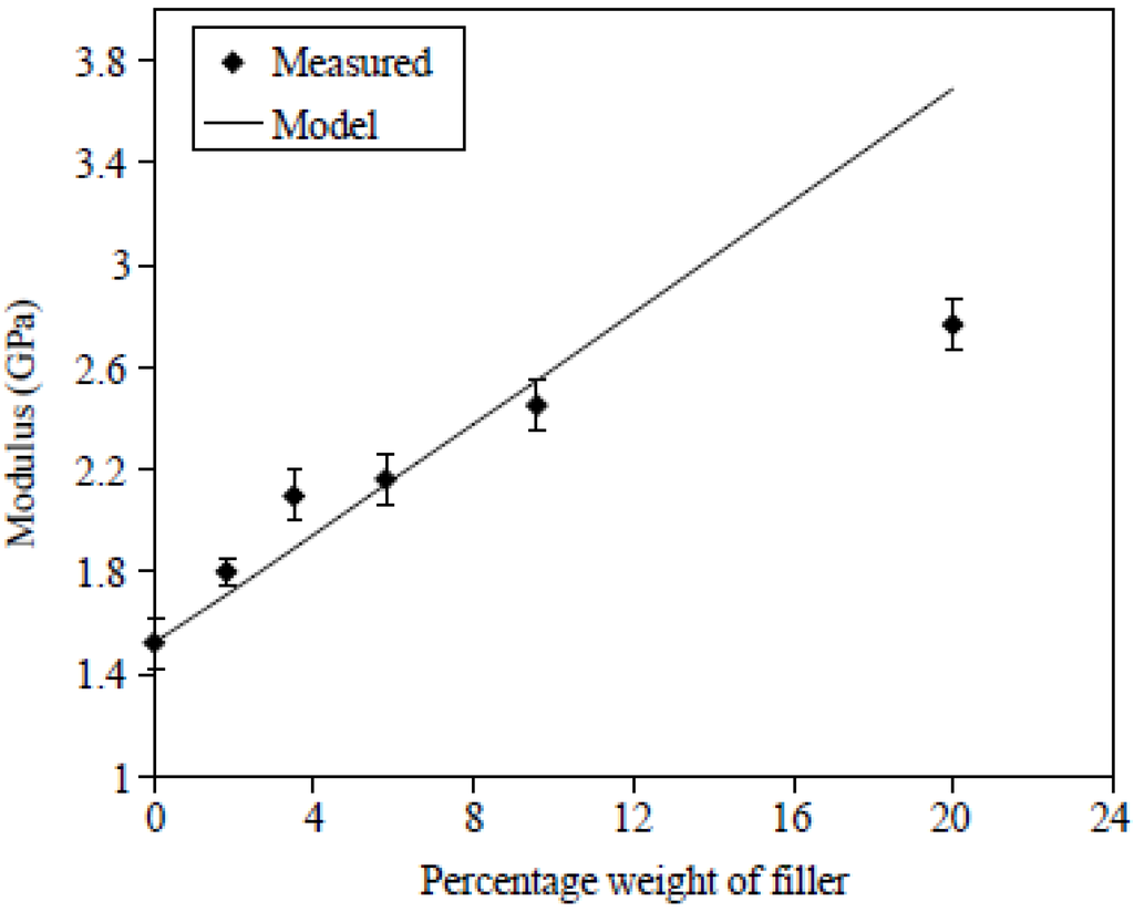A comparison between measured and model predicted Young’s modulus of PP/CNTs composites. Reproduced with permission from ref. [34].