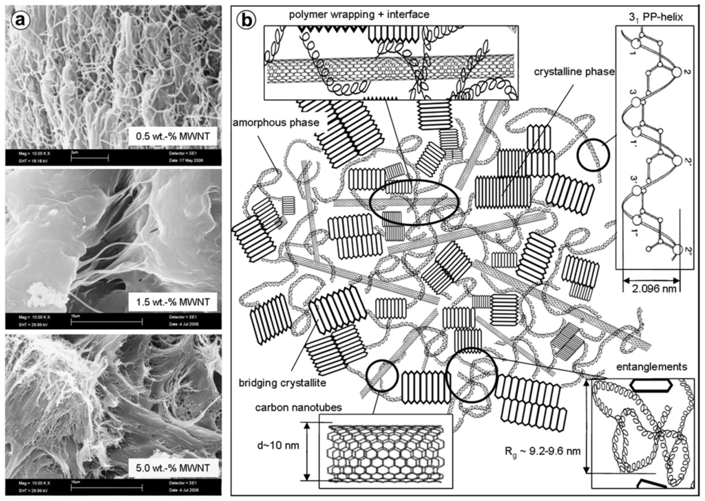 a) SEM investigation: fracture surfaces of nanocomposites with 0.5, 1.5 and 5.0 wt. % MWCNTs, and b) proposed schematic of the state of structural organization and polymer–nanotube interaction in the PP/MWCNTs nanocomposites. Reproduced with permission from ref. [19].