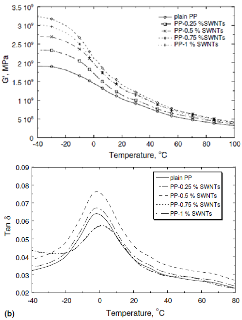 The increase in mechanical properties and the reinforcement effect of CNTs can be also measured with Dynamic Mechanical Analysis (DMA). DMA of polypropylene shows three relaxations at about -80 °C (α), 8 °C (β) and 100 °C (γ), respectively. The γ peak is generally attributed to the relaxation of a few chain segments in the amorphous regions. The β-relaxation represents the glass transition, and α-relaxation is attributed to the lamellar slip and rotation in the crystalline phase. The storage modulus (G') and the mechanical loss factor (tanδ) versus temperature curves at 5 Hz of PP/SWCNTs are shown in Figure 16 [35]. It can be clearly observed in Figure 16a that the storage modulus of iPP is increased with the addition of SWCNTs due to their stiffening effect. However, it was found that the modulus decreases at the highest SWCNTs concentration (1 wt %). Figure 16b displays the tanδ peaks of the neat iPP and its composites filled with different SWCNTs. A displacement of the peak at higher temperatures is observed by the addition of nanotubes. Furthermore, the peak shift is more evident as higher is the nanotube percentage in the composite. This increase in the Tg is attributed to the reinforcing effect of SWCNTs, hindering the mobility of the chains. However, in PP/MWCNTs the glass transition temperature as determined from DMA is decreasing in the case of the nanocomposites compared to the pure iPP matrix [19,36,37]. Dynamic mechanical properties of PP/CNTs nanocomposites were found that depends also from the type of the used CNTs [38].