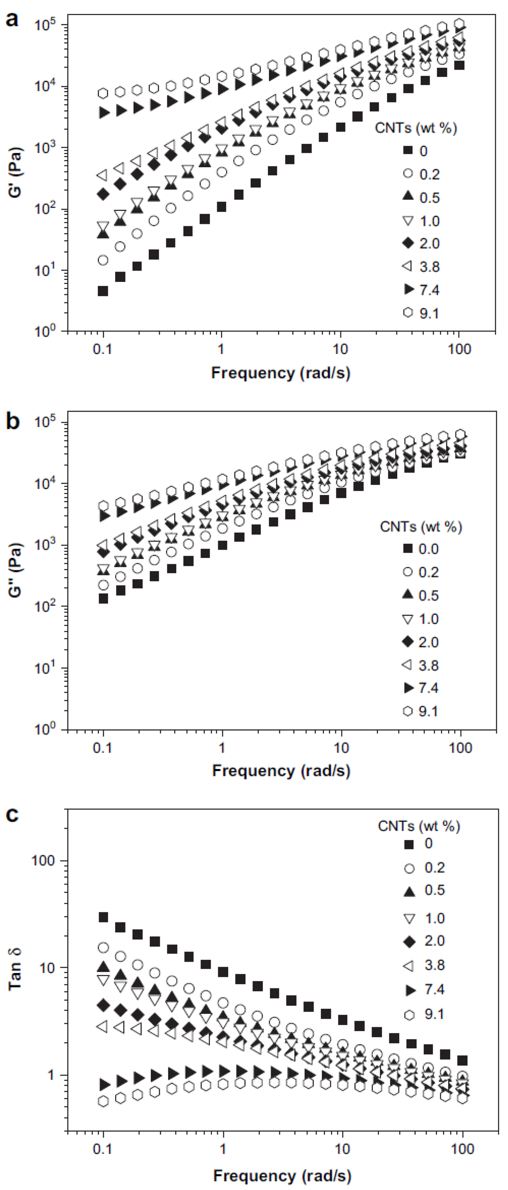 Storage modulus (G') (a), loss modulus (G") (b), and loss tangent, tanδ (c), as functions of frequency for iPP/CNTs with different CNT concentrations. Rheological measurements were performed with a strain of 2% at 200 °C. Reproduced with permission from ref. [42].
