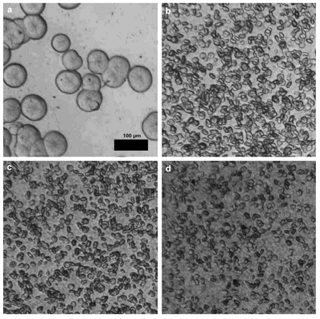Optical micrographs of iPP/CNTs with CNTs concentrations of a) 0 wt %, b) 0.2 wt %, c) 0.5 wt % and d) 1.0 wt %, during isothermal crystallization at 136 °C for 21 min, 6 min, 6 min, and 6 min, respectively. Optical micrographs were taken in bright field. Reproduced with permission from ref. [42].