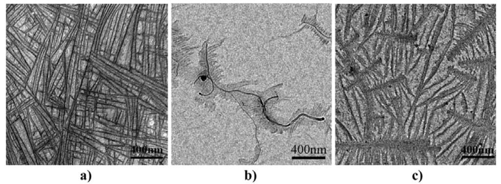 Even though a lot of published papers discuss the nucleation ability of CNTs on crystallization of semicrystalline polymers, the reasons why CNTs can be efficient nucleating agents have not been explained clearly. The authors consider that CNTs surfaces might help decrease the energy barrier for nucleation of polymer crystallization due to the evolved interactions between CNTs and PP macromolecules. For a better understanding of these interactions between CNTs and the surrounding iPP matrix, some researchers have performed crystallization experiments in ultrathin films of iPP and CNTs [58]. For this purpose, a droplet of the pure aqueous polypropylene latex dispersion or the CNTs/iPP latex dispersion was deposited on an amorphous carbon-coated TEM grid, heated to 180 °C for 5 min, and subsequently cooled to room temperature so that the iPP can crystallize. Figure 19 shows TEM bright-field images in slight defocus conditions; in contrast to stained samples, in case of phase contrast imaging as applied here, the darker lines correspond to the lamellar crystals. Again, for the neat iPP the common cross-hatched morphology is formed (Figure 19a).