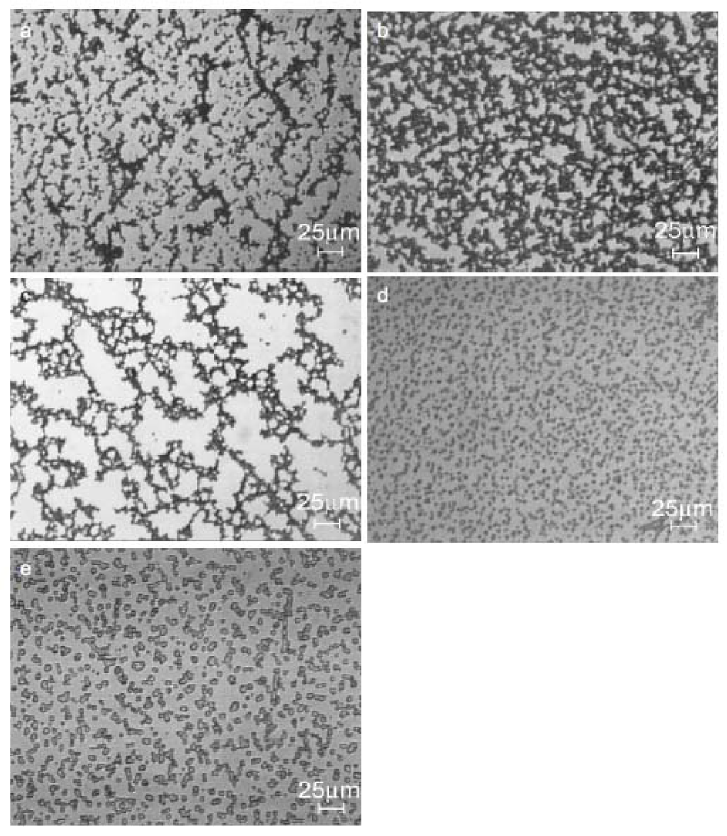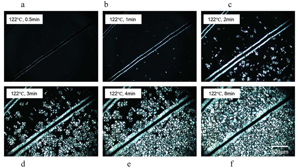 Isothermal crystallization behaviors of iPP/CNTs with CNTs concentrations less than 2.0 wt % at several selected temperatures between 136 °C and 144 °C were studied by using optical microscopy [42]. Typical optical micrographs taken at 136 °C for certain times are presented in Figure 18.