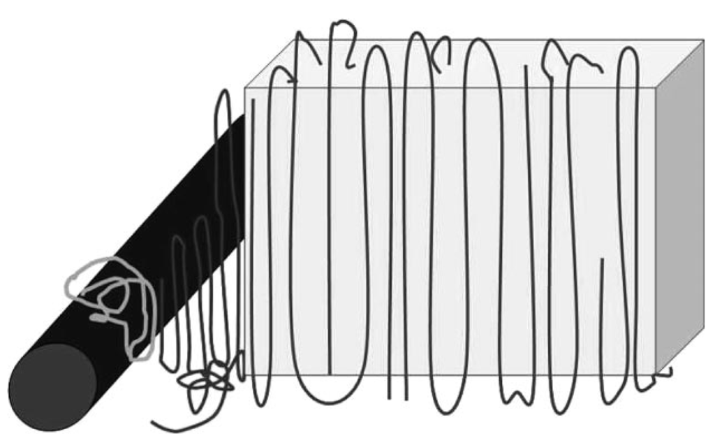These observations prompt first the understanding that the polymer wrapping phenomenon is being largely confined to the amorphous regions and secondly the fact that the immobilized polymer layer at the polymer–nanotube interface allows the low enthalpy mobility of the free chain ends to take place withgreater ease. The i-PP exists in a 31-helix conformational arrangement with a radial dimension of 2.096 nm about its mean chain axis (c-axis). Based on these findings, a qualitative structural model about the state of the relative organization of the PP chains and nanotube has been proposed and is shown schematically in Figure 15b. The model clearly adheres to all the above detailed illustrations, though not exactly up to the scale, and fundamentally complements the understanding of the macro-scale properties correlation to nanoscale organization in the case of two component polymer based systems [19].