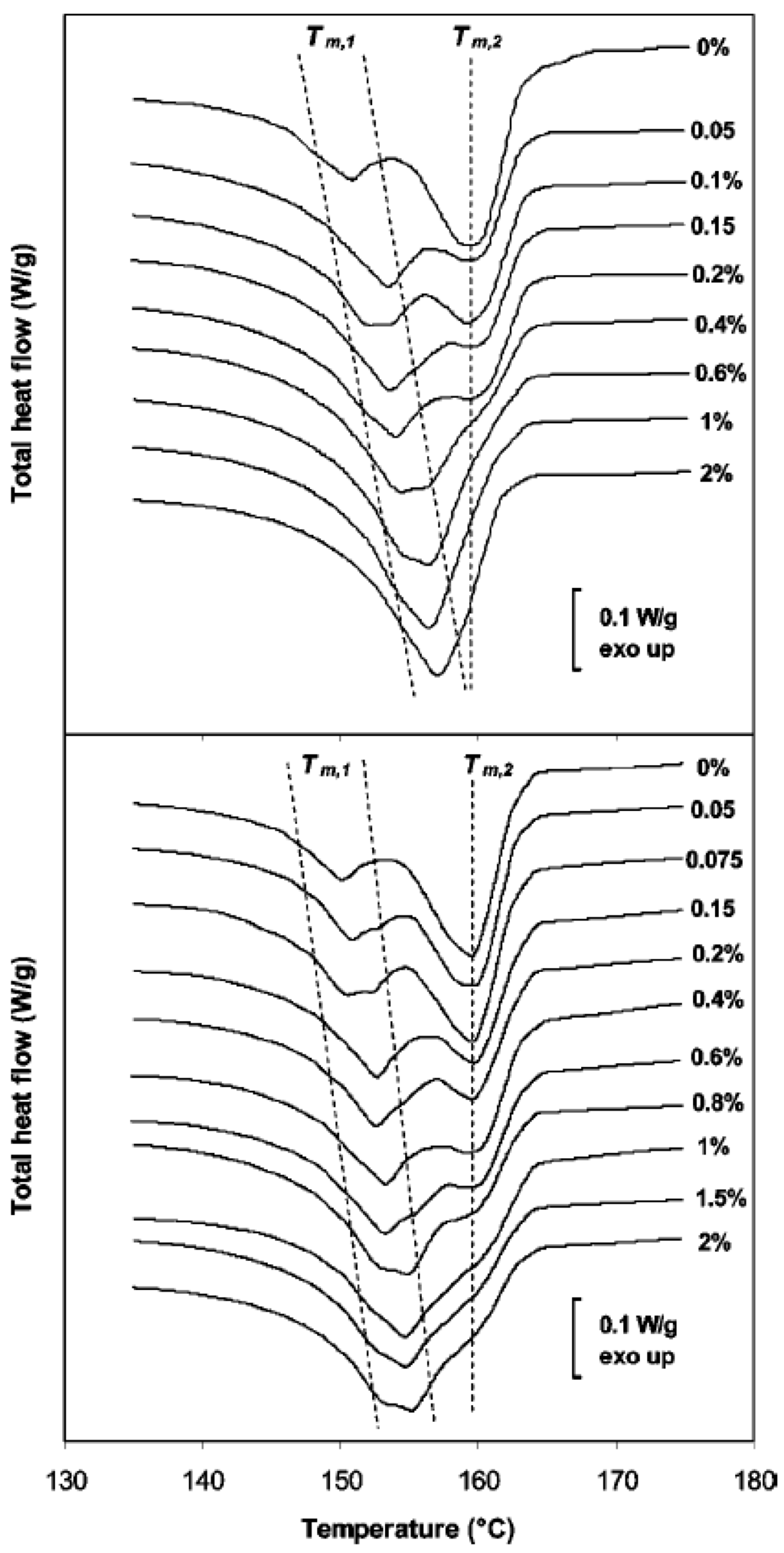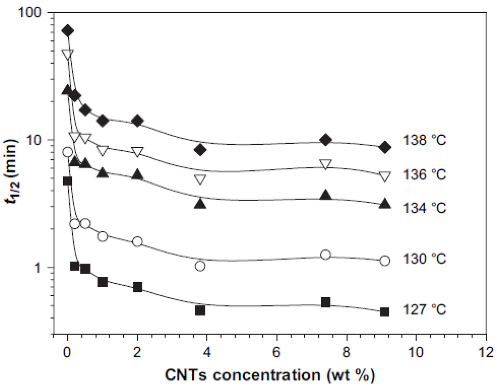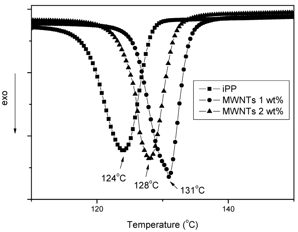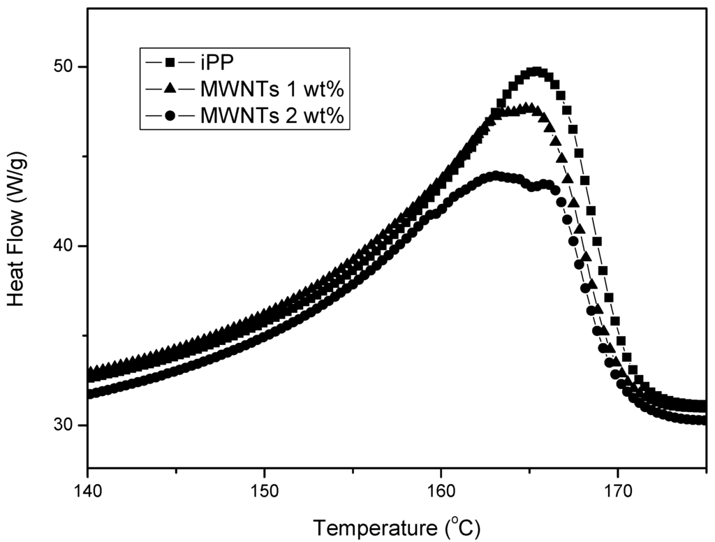 CNTs cause also a serious effect on the crystallization rate of PP and this can affect most of its properties. For this reason a lot of researchers have studied extensively the effect of CNTs on PP crystallinity [30,43,44,45,46,47,48,49,50,51,52,53,54]. iPP has normally a slow crystallization rate, forming large spherulites. Nucleation can be homogeneous or heterogeneous. Homogeneous nucleation is the process in which nuclei form spontaneously in the PP melt as it cools down. This crystallization will not occur before the melt is super cooled well below the equilibrium melting temperature. On the other hand, during heterogeneous nucleation the crystallite growth is initiated by foreign bodies within the molten phase. In this case, crystallization tends to occur at higher temperatures, closer to the melting point of PP. Therefore, heterogeneous nucleation is amply used to enhance the mechanical properties and/or to provide consistent optical properties.